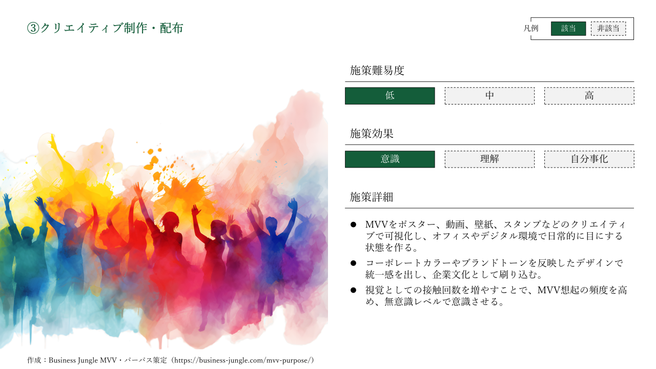 例えば、MVVを「まったく意識していない層」に対してはMVVを意識させる施策が必要であり、「理解しているが自分事化していない層」に対しては自分事化を促す施策が必要です。
