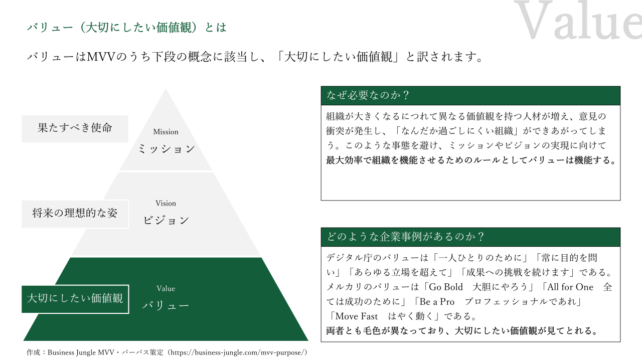 バリューはMVV(ミッション・ビジョン・バリュー)のうち下段の概念に該当し、日本語では「大切にしたい価値観」と訳されます。