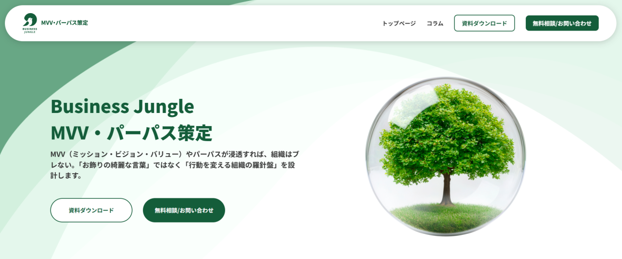 もし、MVVやパーパスの言語化や社内展開にお悩みであれば、わたしたち「Business Jungle MVV・パーパス策定」がお手伝いできるかもしれません。外資戦略コンサルやデザイナー出身者を含む多様な専門チームが、あなたの会社らしいMVV・パーパスを共にかたちにします。