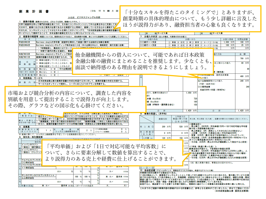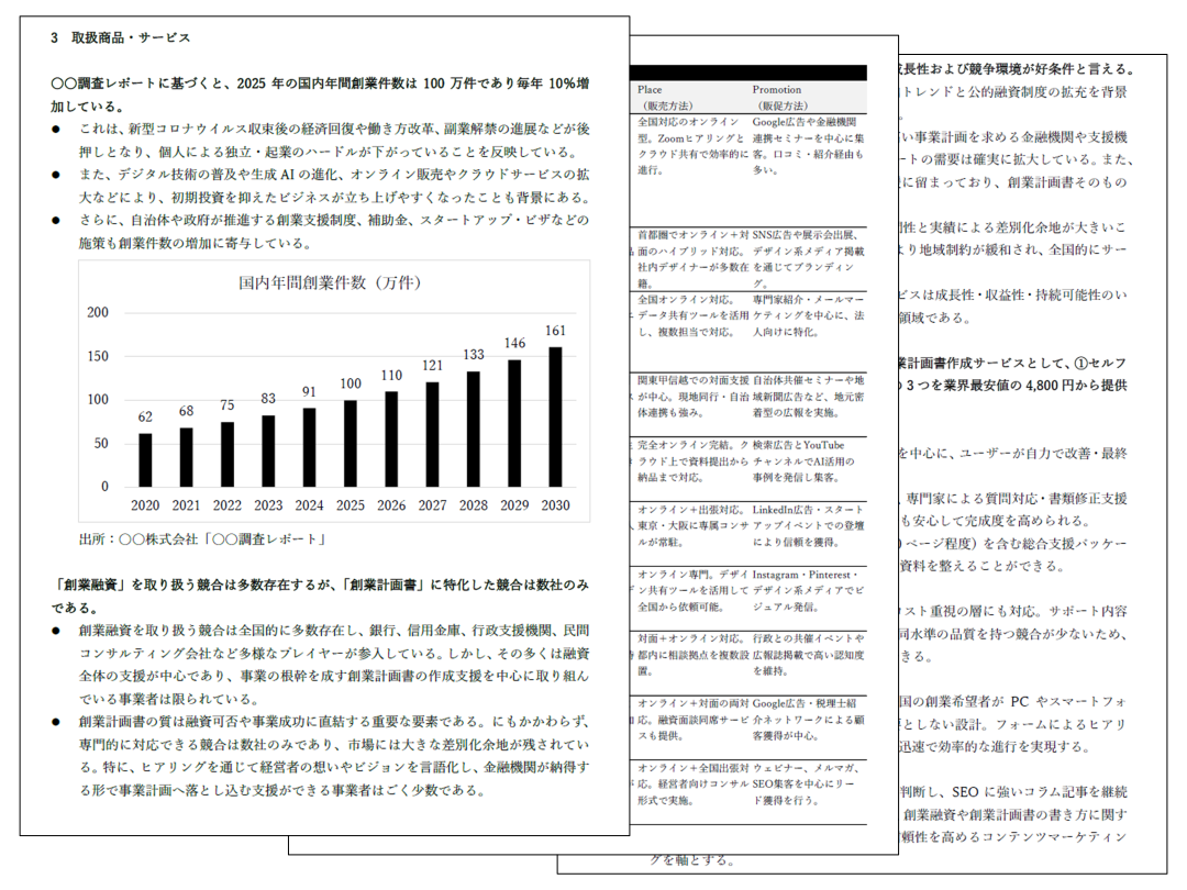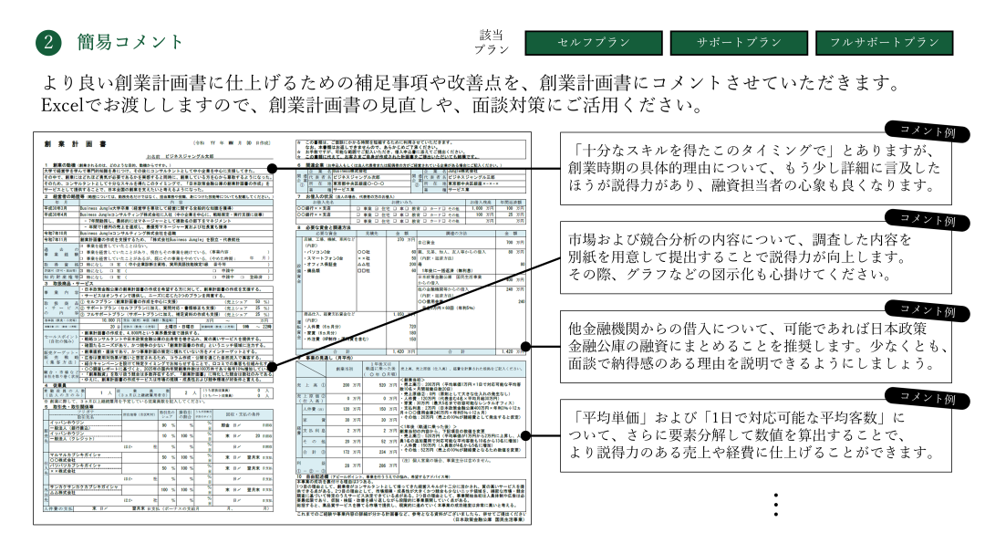 創業計画書と簡易コメントはExcel(1ページ分)、融資向け補足資料はWord(10ページ程度)にて納品させていただきます。
