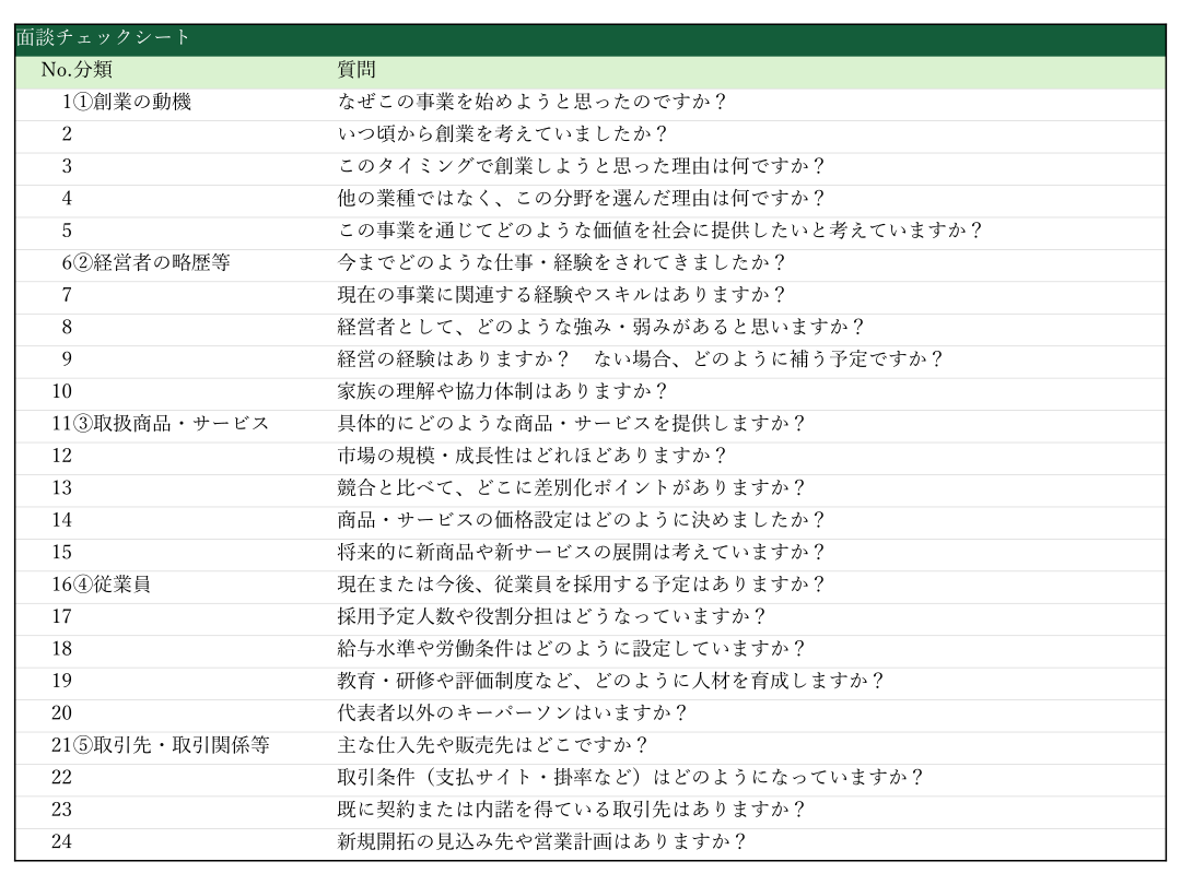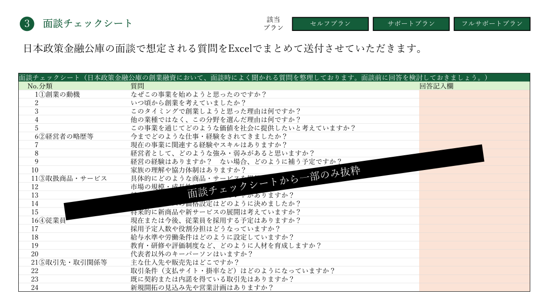 日本政策金融公庫の創業融資は、書類提出だけではなく面談も実施されます。そのため、面談チェックシートでは、面談で想定される質問をExcelでまとめて送付させていただきますので、面談対策もバッチリです。