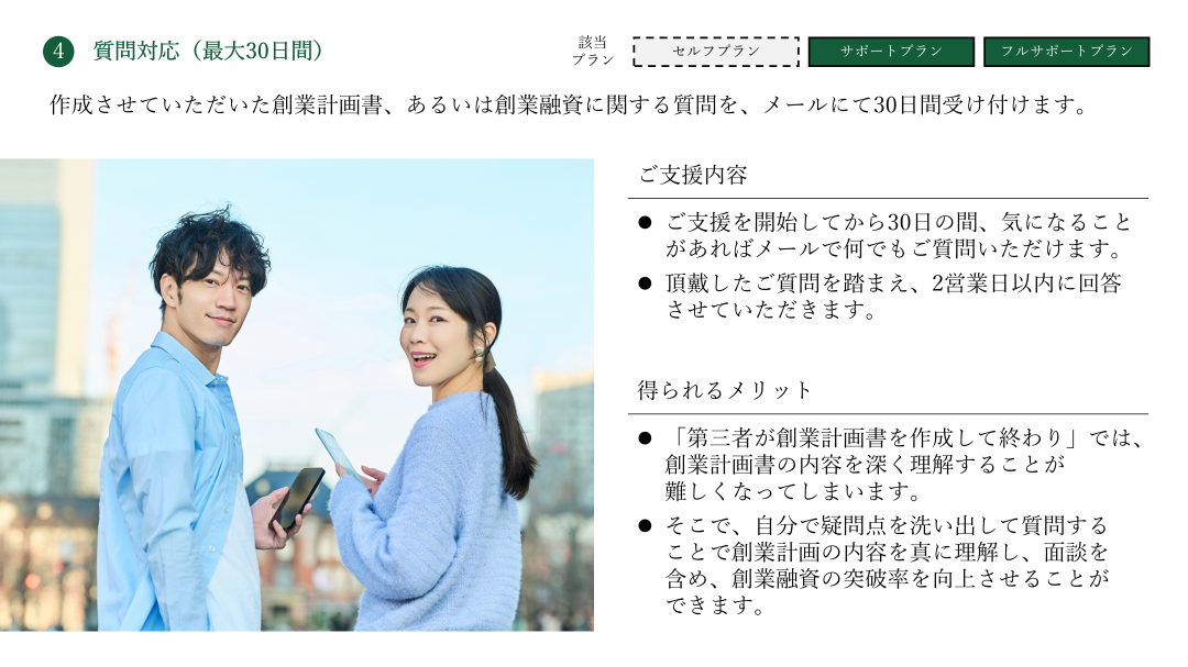 作成させていただいた創業計画書、あるいは創業融資に関する質問を、メールにて30日間受け付けます。自分で考えて質問することで、創業計画の内容を真に理解し、実践していくことができます。