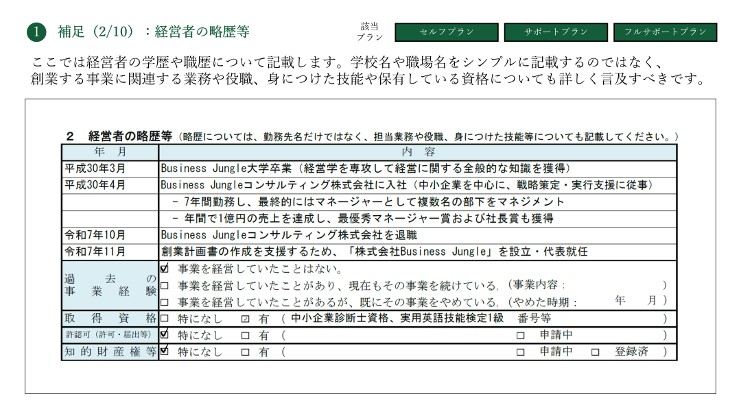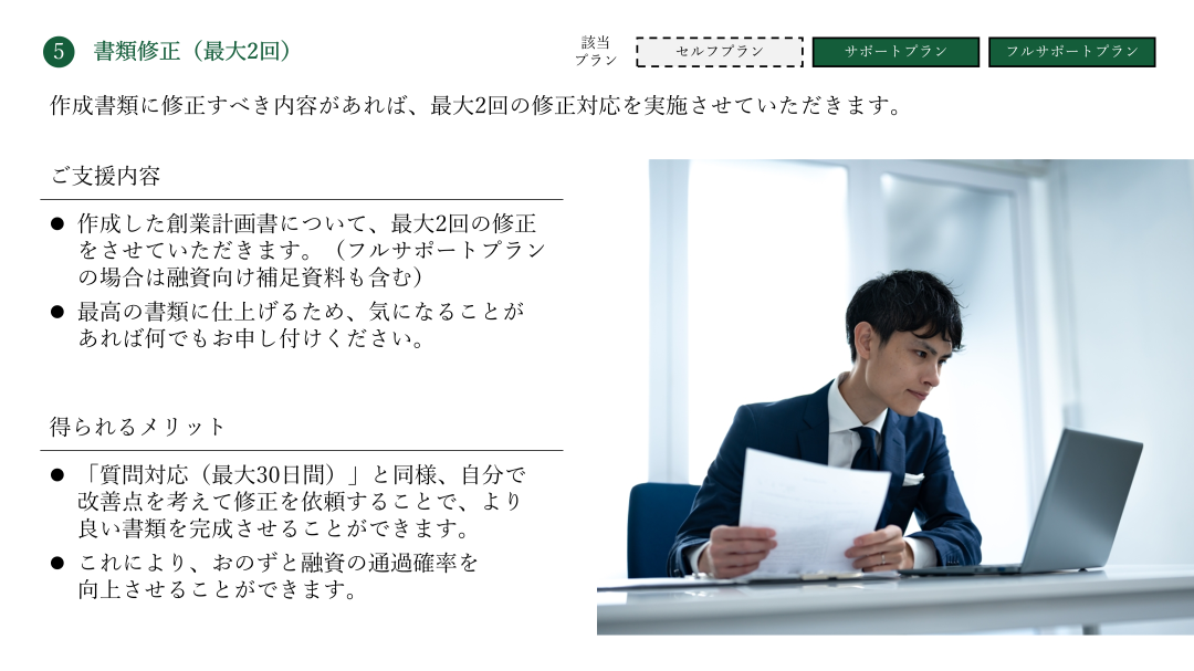 サポートプランまたはフルサポートプランをご利用の場合は、創業計画書の作成から30日間、質問対応と書類修正(最大2回)がございます。より良い創業計画書に仕上げましょう!
