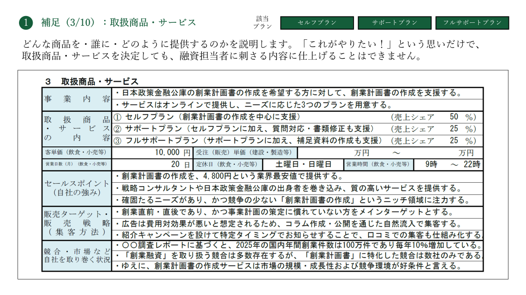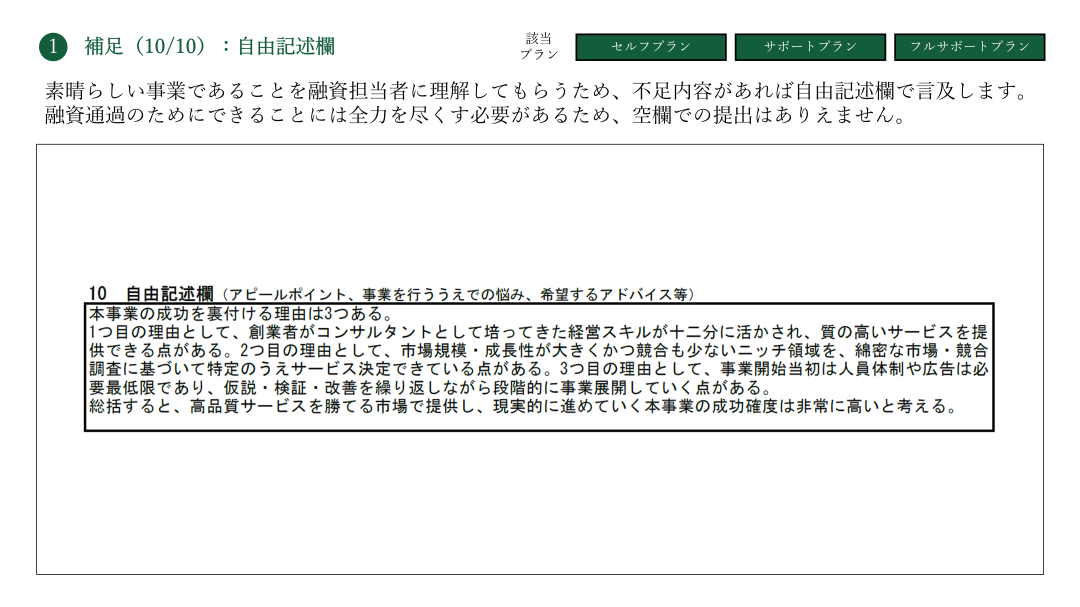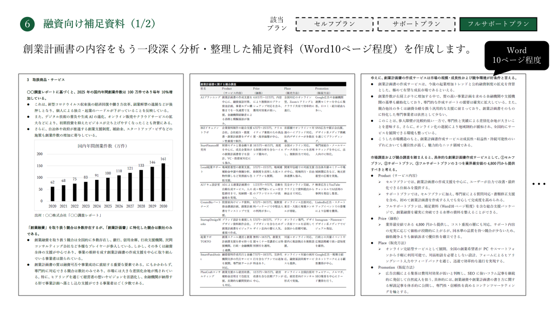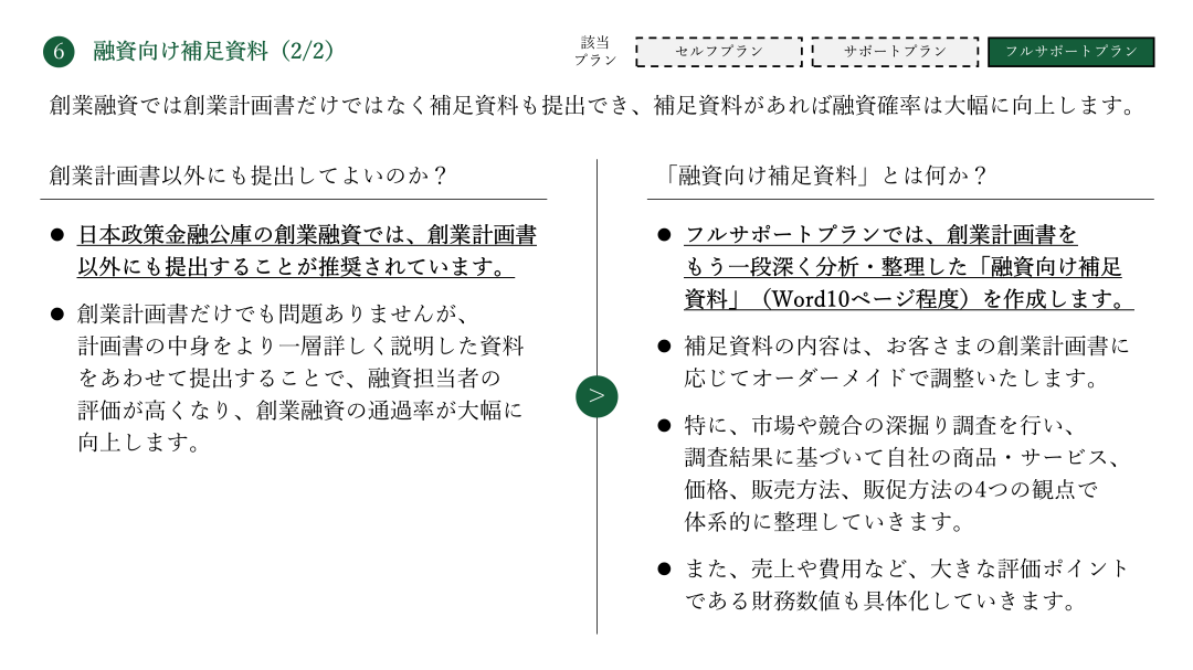 創業融資では、創業計画書だけではなく補足資料も提出でき、補足資料があれば融資確率は大幅に向上します。フルサポートプランでは創業計画書の内容をもう一段深く分析・整理した補足資料(Word10ページ程度)を作成させていただきます。