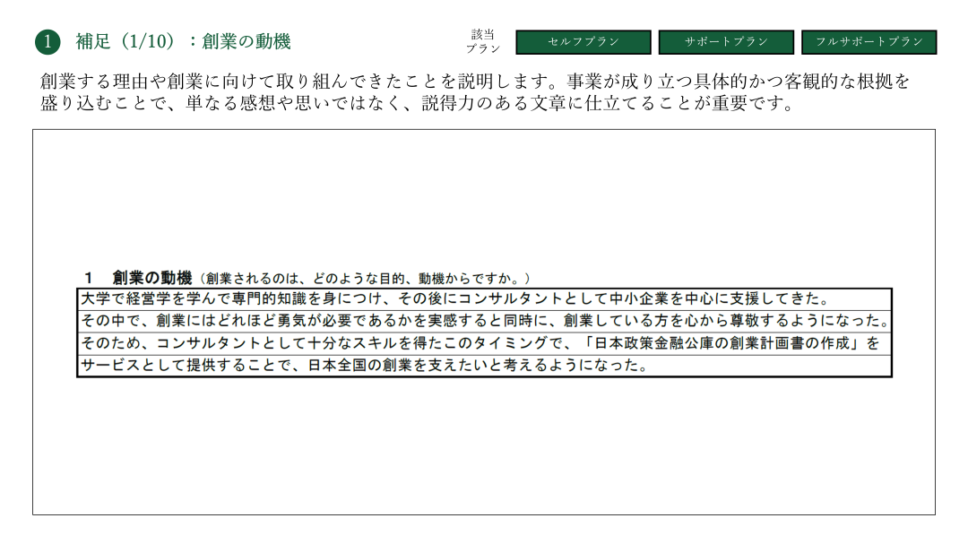 「創業計画書ができれば、後は自分で頑張りたい!」という方はセルフプラン、「質問対応・資料修正で創業計画書を改善したい!」という方はサポートプラン、「補足資料も作成して、融資突破の確率を最大化したい!」という方はフルサポートプランがおすすめです。悩んだらセルフプランから始めて、その後に様子を見ながらプラン変更してもいいかもしれません。