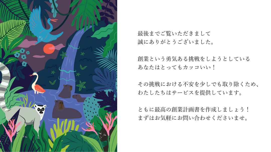 お取引に問題がなければ、資料一式を納品させていただきます。ここまで来れば、最高の創業計画書が出来上がっているはずです。お疲れさまでした!