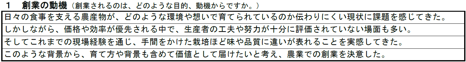 この項目では、農業を通じて何に取り組みたいのか、どのような方向性で事業を考えているのかが伝わるよう、背景となる考えを整理して記載します。