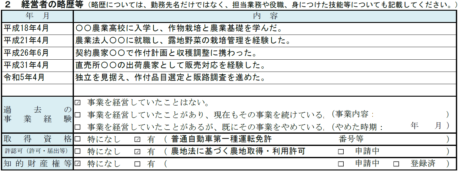 経営者の略歴等では、学歴とこれまでの職務経験を時系列で整理し、農業経営との接点が分かるように記載します。農業に直接関係する学習経験がない場合でも、事業運営に生かせる知識や経験があれば、その点を整理して示すことが大切です。