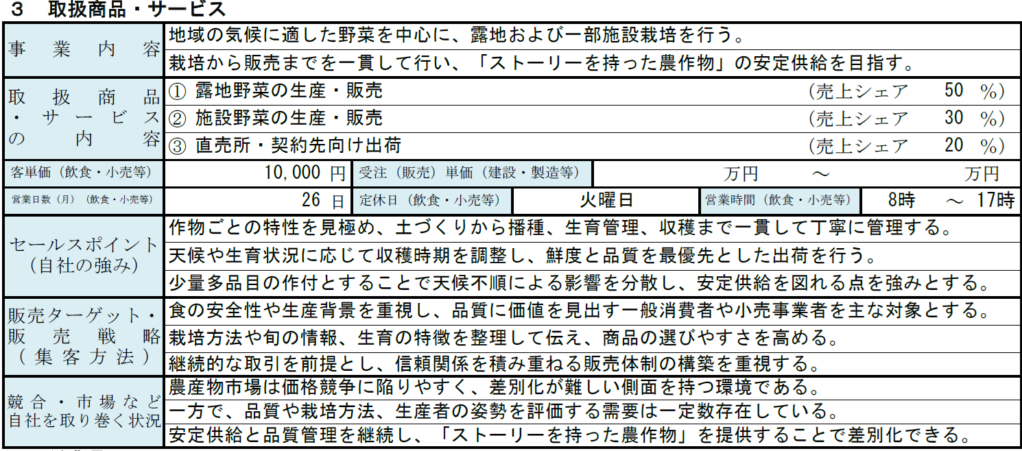 取扱商品・サービスの内容では、事業の核となる農産物やサービスを3つ記載します。たとえば、主力となる作物、加工を前提とした農産物、体験型や直売を含む取り組みなど、事業の特徴が分かるものを整理します。
