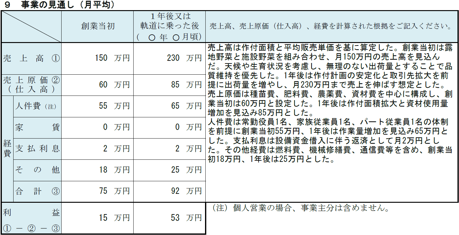 まず売上高については、作付面積、収穫量、販売先などを踏まえ、どのような構造で売上が成り立つかを説明します。販売時期や販売方法によって売上の発生時期が偏る点も考慮する必要があるかもしれません。