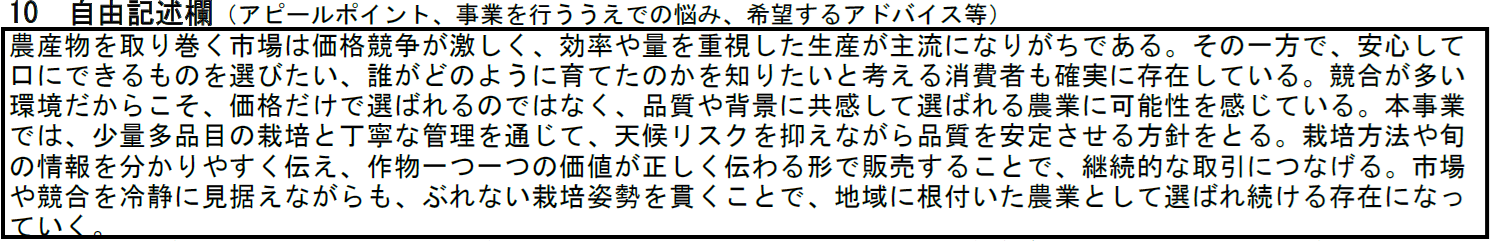 自由記述欄では、これまでに整理してきた内容を踏まえ、農業を経営としてどのように進めていくのかをまとめます。この項目では、個別の数値や詳細な計画を書くのではなく、事業の方向性や考え方を整理することが大切です。