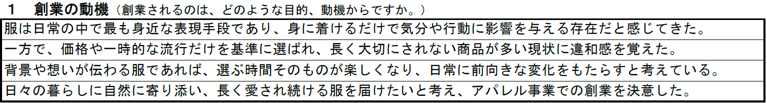 この項目では、創業を決意するに至った考えの変化や関心の深まりを中心に、どのような視点でアパレル事業と向き合おうとしているのかが伝わるように記載します。