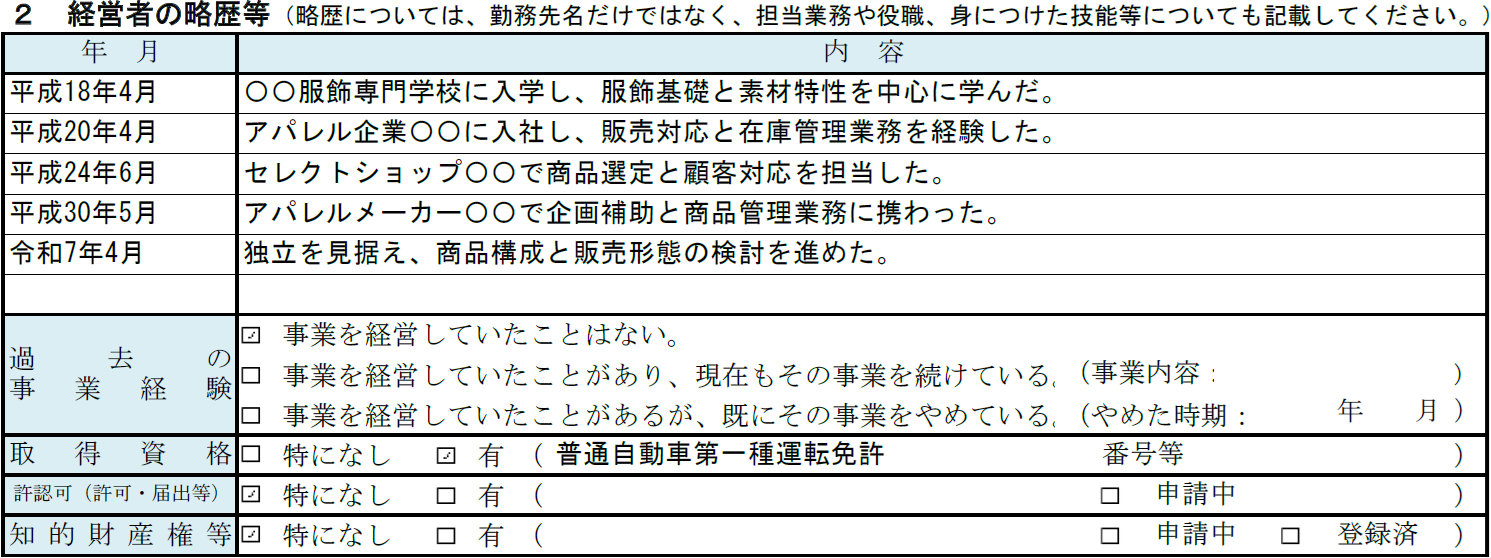 アパレル事業の記入例② 経営者の略歴等
