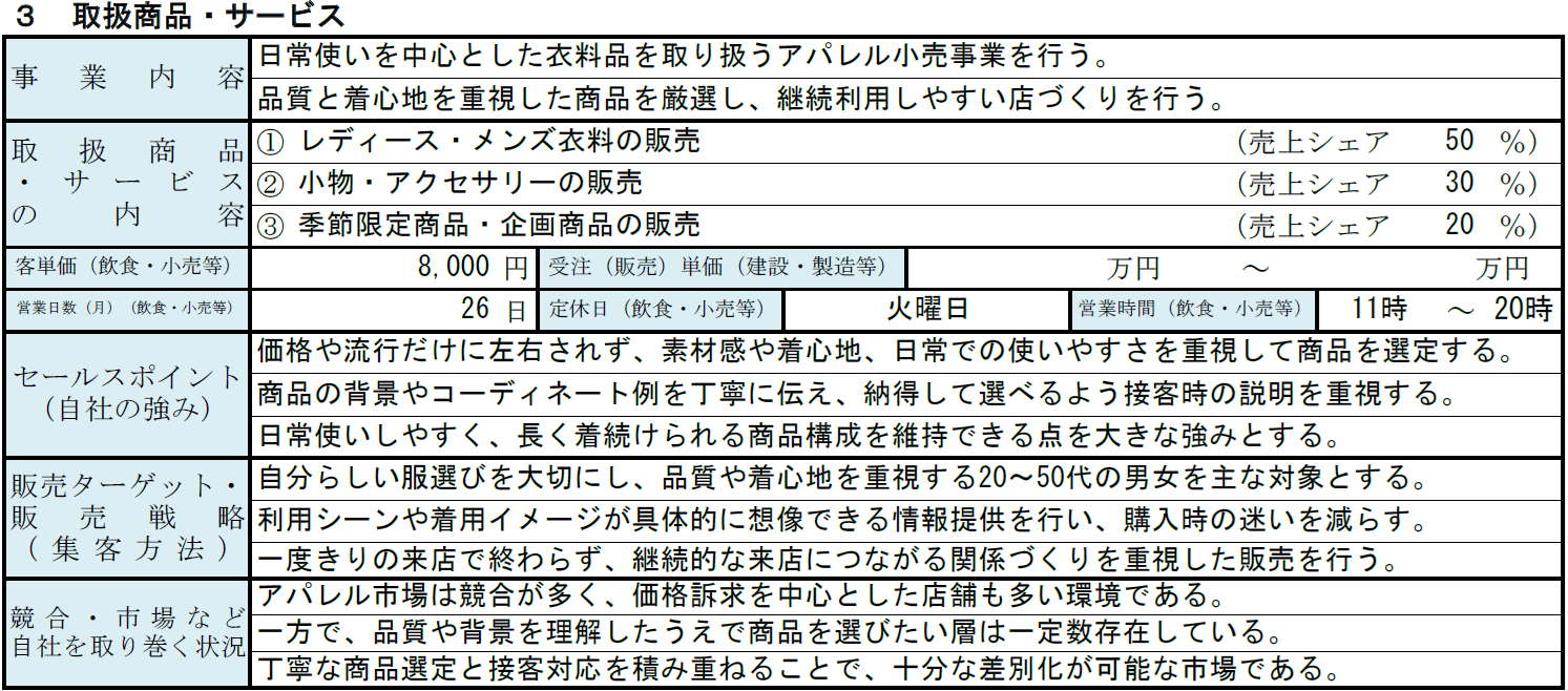 取扱商品・サービスの内容としては、事業の核となる商品やサービスを3つ記載します。たとえば、日常使いを想定したベーシックアイテム、素材やシルエットに特徴を持たせたオリジナル商品、コーディネート提案を含めた販売サービスなど、事業の特徴が伝わるものを整理していきましょう。