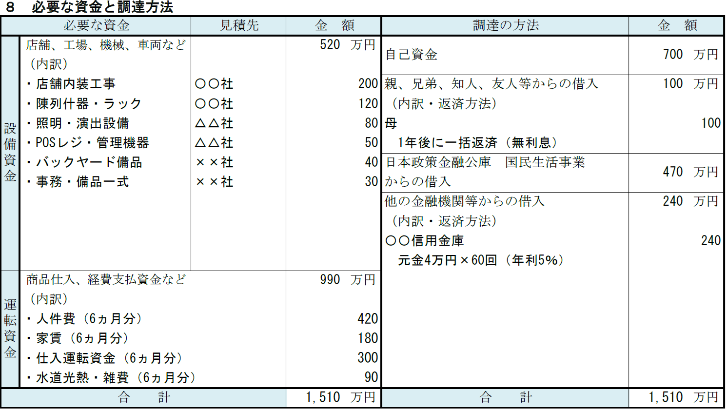 アパレル事業の記入例⑧ 必要な資金と調達方法
