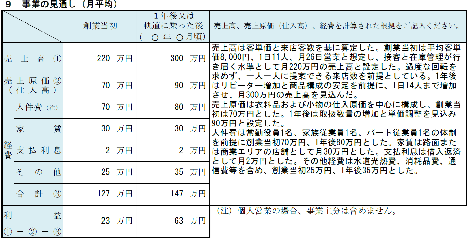 アパレル事業の記入例⑨ 事業の見通し