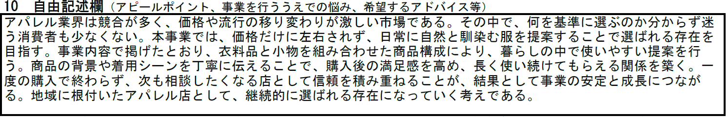 アパレル事業の記入例⑩ 自由記述欄