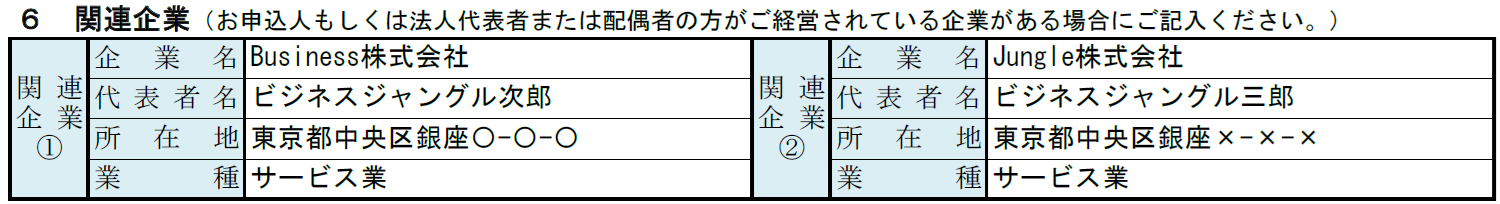 関連企業の項目では、申込人または配偶者が経営している企業がある場合に、その内容を整理して記載します。アパレル事業と直接関係する企業に限らず、該当する企業がある場合は漏れなく記載するようにしましょう。