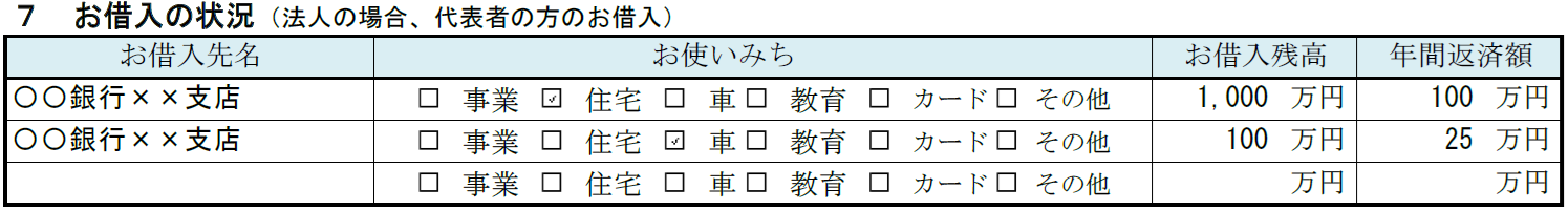 お借入の状況では、法人代表者または個人事業主本人が利用している借入内容について記載します。