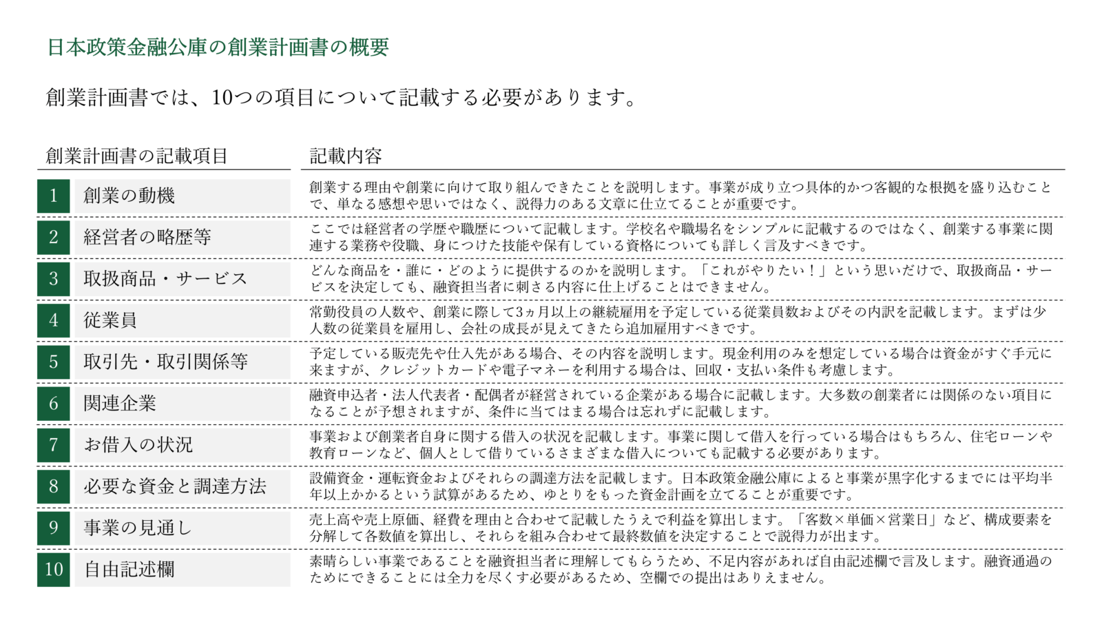 そして、記載しなくてはいけないのは、①創業の動機、②経営者の略歴等、③取扱商品・サービス、④従業員、⑤取引先・取引関係等、⑥関連企業、⑦お借入の状況、⑧必要な資金と調達方法、⑨事業の見通し、⑩自由記述欄、の10項目であり、それぞれの項目に応じて押さえるべきポイントも異なっています。