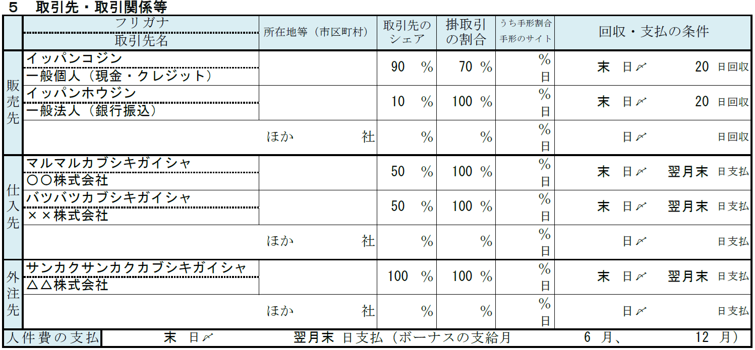 取引先・取引関係等の項目では、自分たちの事業と外部との関係性を販売先・仕入先・外注先の3つの観点で整理のうえ、お金の流れとして人件費の支払条件も検討しておきます。