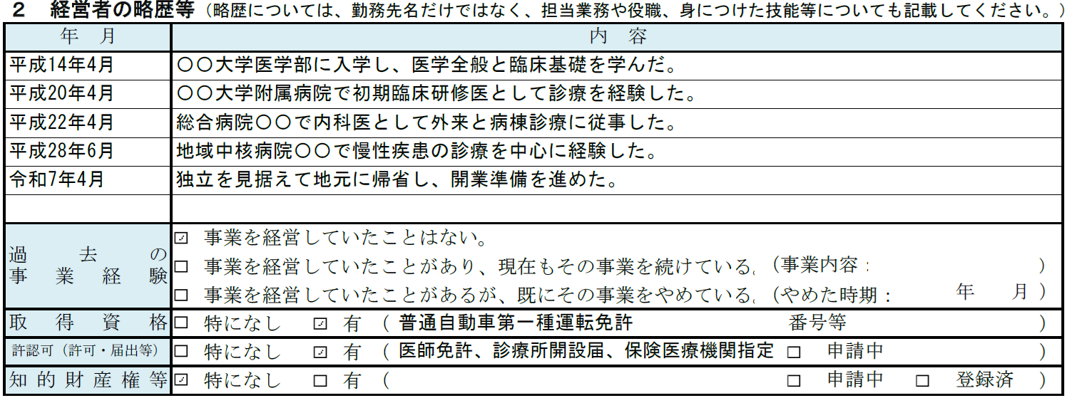 クリニック(医院・診療所)の記入例② 経営者の略歴等
