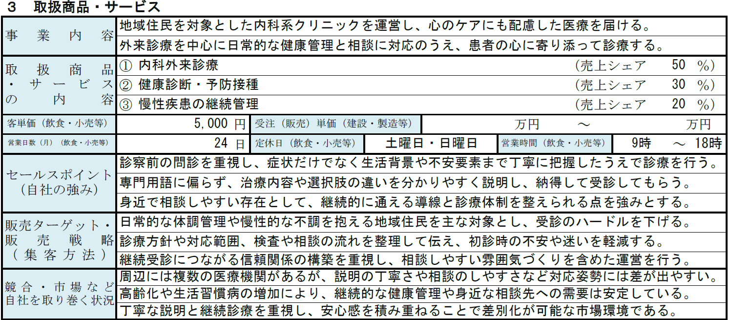 取扱商品・サービスの内容としては、事業の中心となる診療内容や医療サービスを3つ記載します。たとえば、一般外来診療、慢性疾患の継続管理、予防医療や健康相談など、クリニックの特徴が分かるものを整理します。