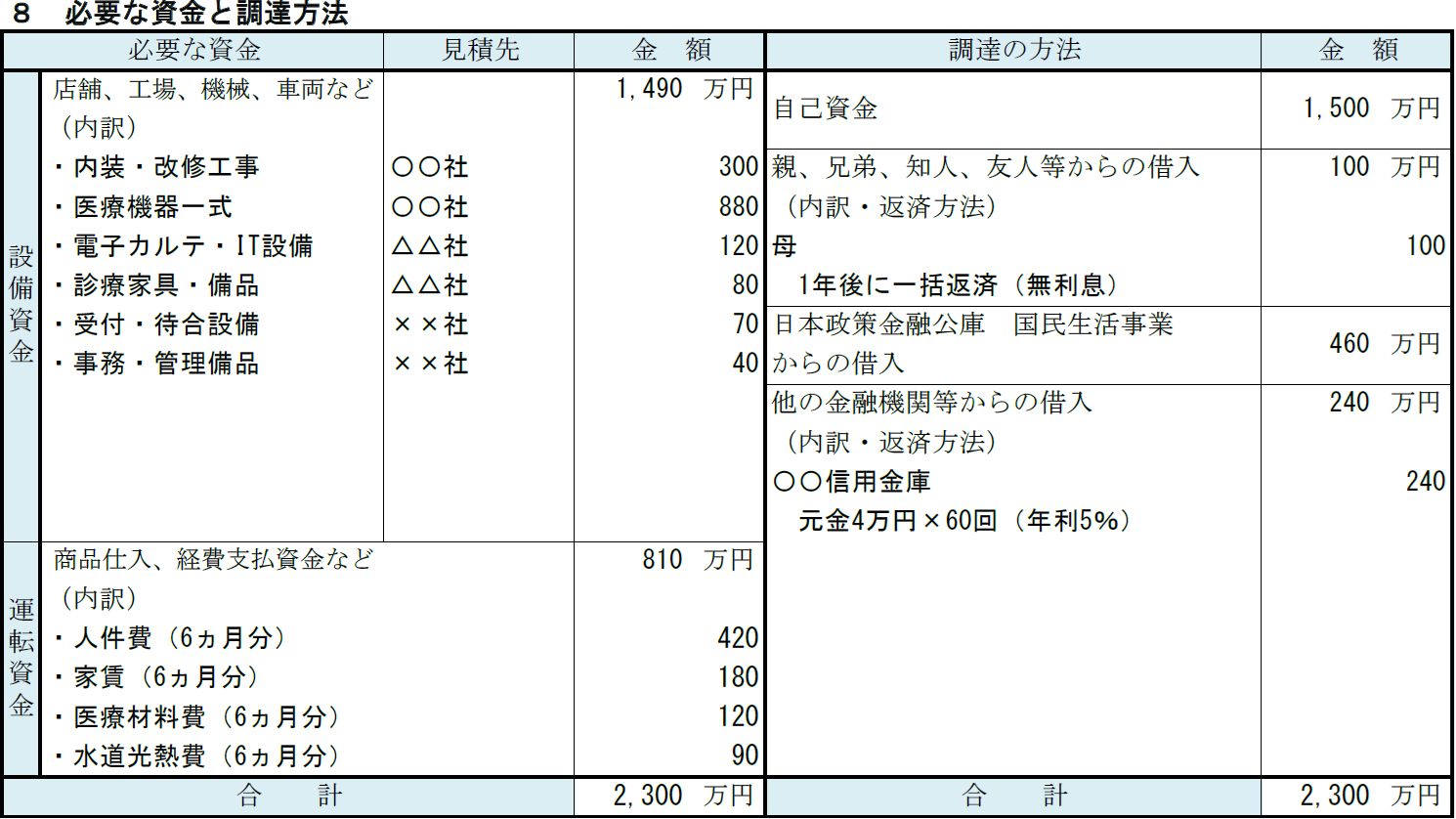クリニック(医院・診療所)の記入例⑧ 必要な資金と調達方法