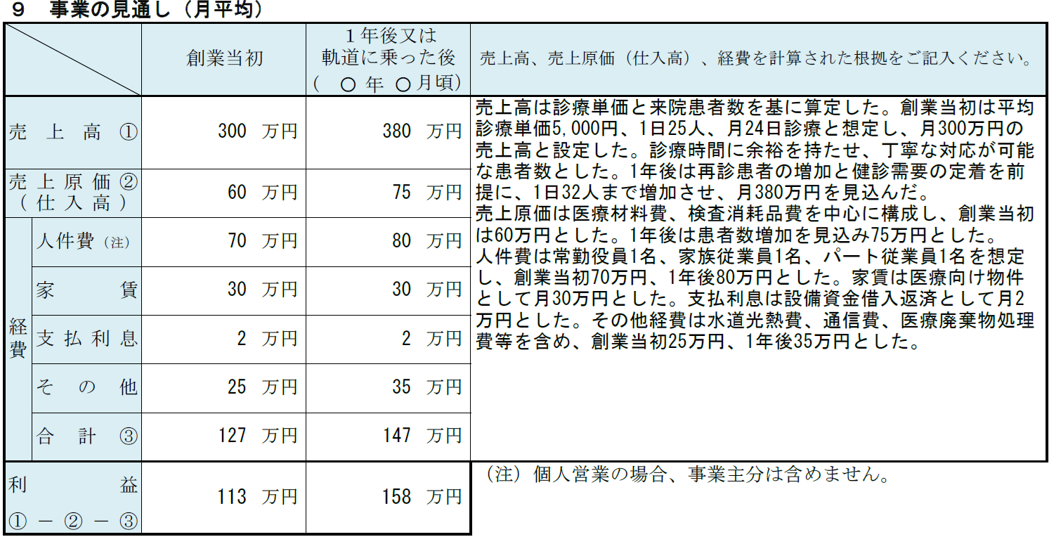 クリニック(医院・診療所)の記入例⑨ 事業の見通し