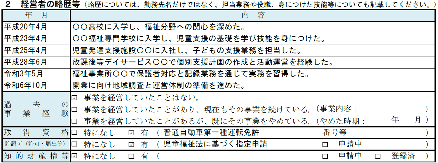 放課後等デイサービスの記入例② 経営者の略歴等