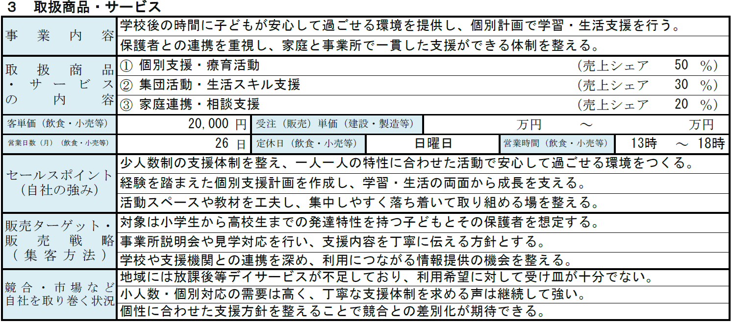 放課後等デイサービスの記入例③ 取扱商品・サービス