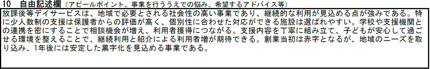 自由記述欄では、事業所づくりで大切にしたい価値観や、子どもたちと向き合う姿勢をまとめます。学校のあとに安心して過ごせる場所をつくりたいという思いや、子どもたちが自分らしくいられる時間を守りたいという考えがある場合には、そのような思いを記載します。