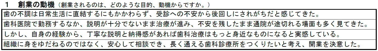 創業の動機では、歯科診療所を開設しようと考えるに至った背景や関心の持ち方を整理して記載します。