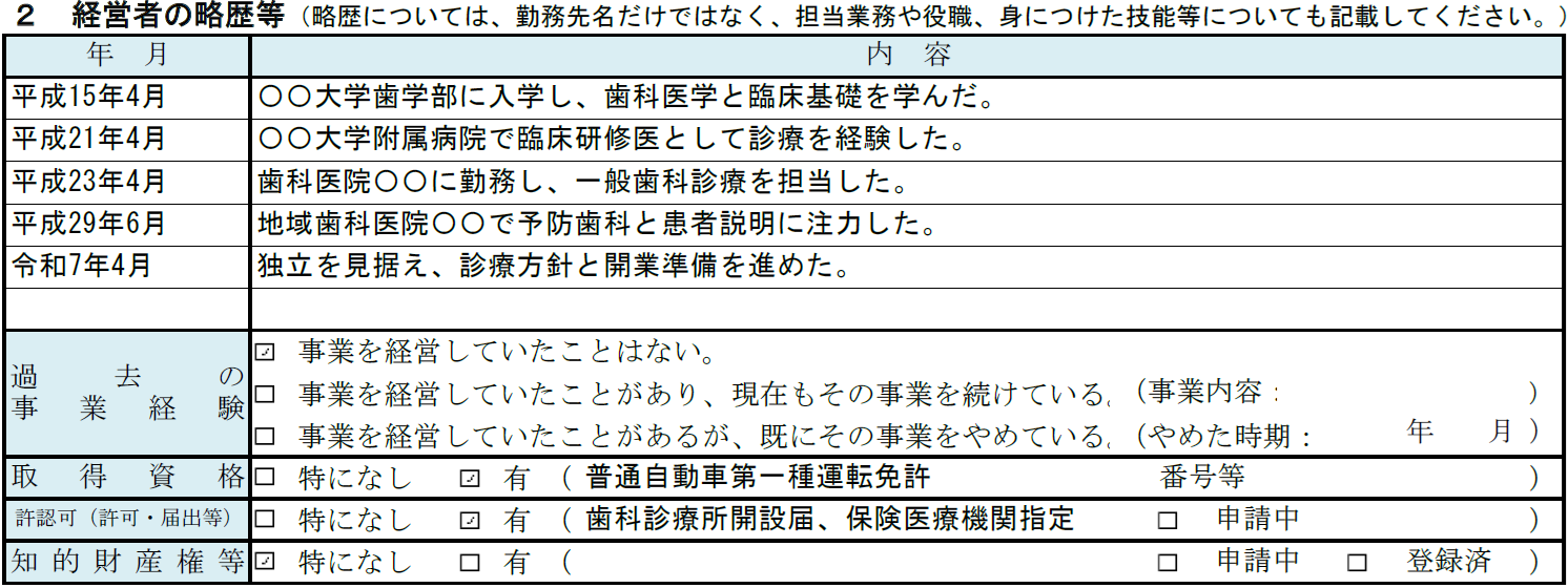 歯科診療所(歯医者)の記入例② 経営者の略歴等