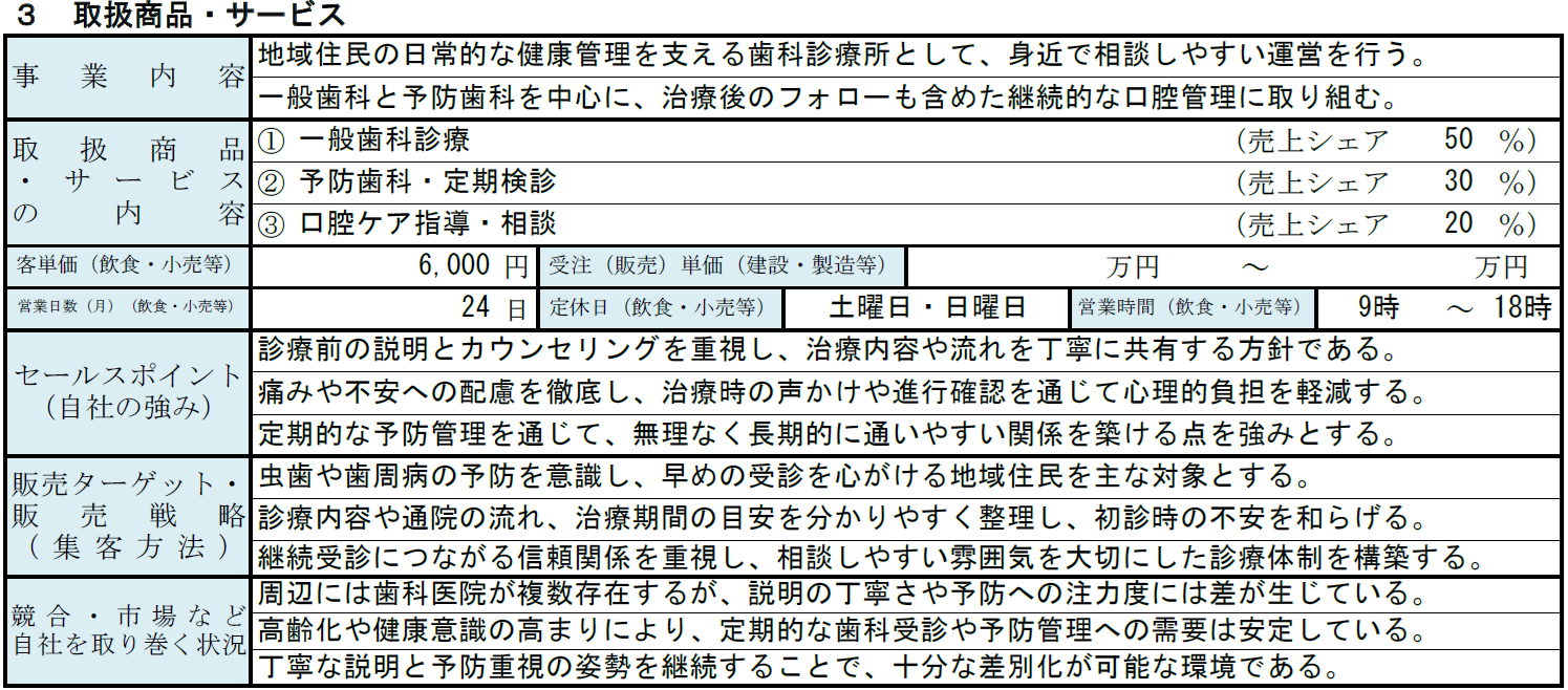 取扱商品・サービスの内容としては、事業の中心となる診療内容を3つ整理します。例えば、一般的な歯科診療、予防・メンテナンスを中心とした診療、審美や機能回復に関わる診療など、診療所の特徴が分かる切り口で整理すると、事業の全体像が伝わりやすくなります。