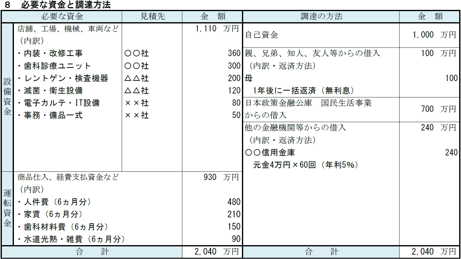 歯科診療所(歯医者)の記入例⑧ 必要な資金と調達方法