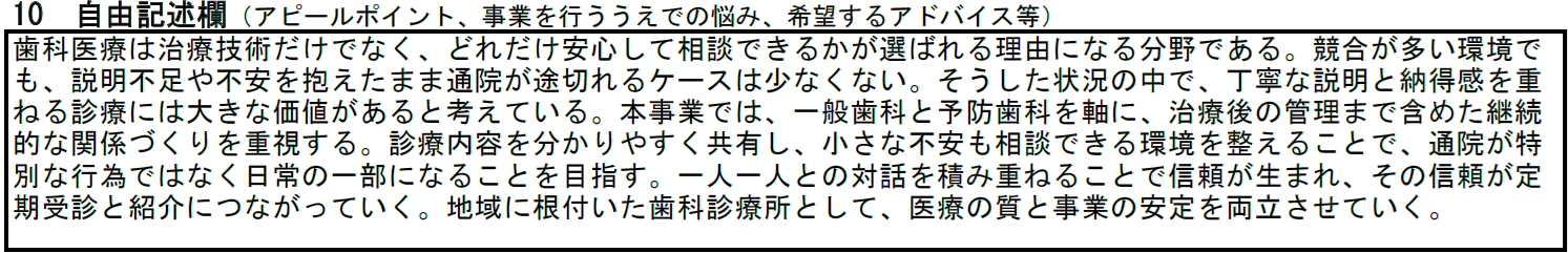 自由記述欄では、創業計画書全体を通じて整理してきた内容を踏まえ、歯科診療所としてどのような事業を構想しているのかをまとめます。具体的な数値や制度の説明ではなく、事業全体のストーリーを描くようなイメージです。