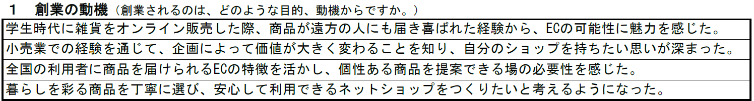 さらに、商品選びの基準を研究したり、仕入れ先を探したり、ECモールと自社サイトの違いを学んだり、配送や在庫管理の仕組みを理解したりといった準備を続けてきたことを記載すると、創業に向けて丁寧に進めてきた姿勢が自然に伝わります。