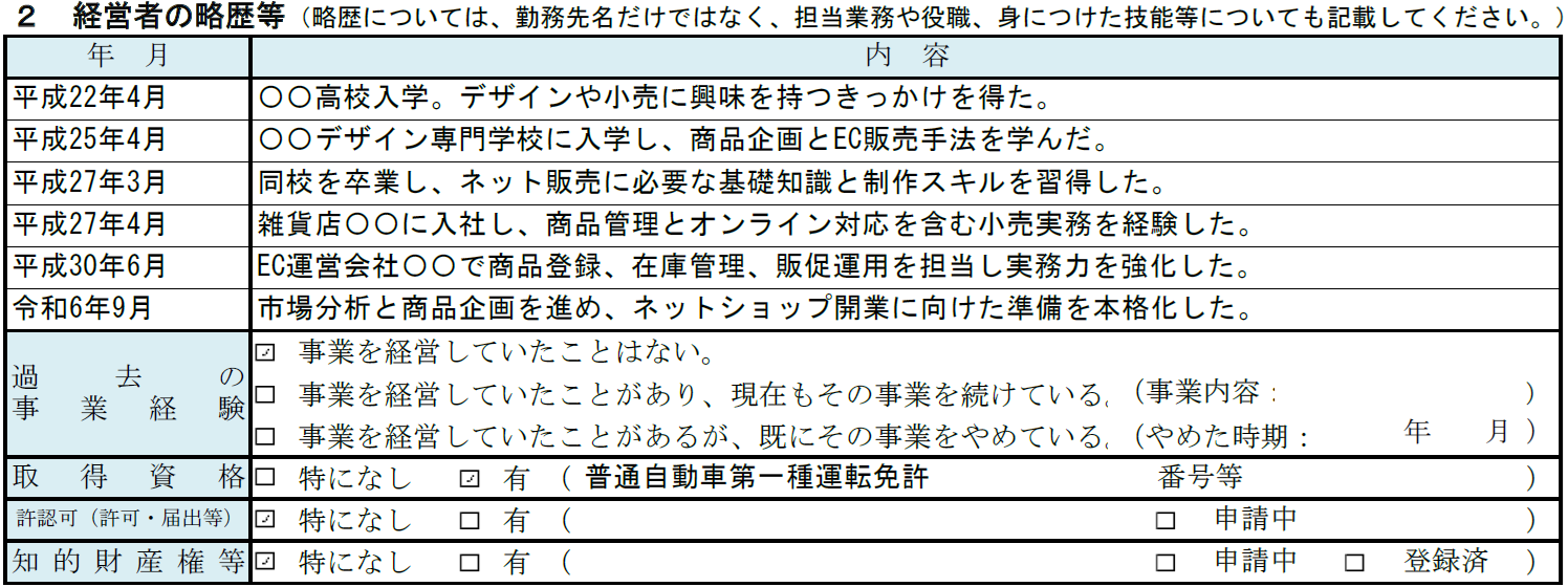 EC(ネットショップ)の記入例② 経営者の略歴等