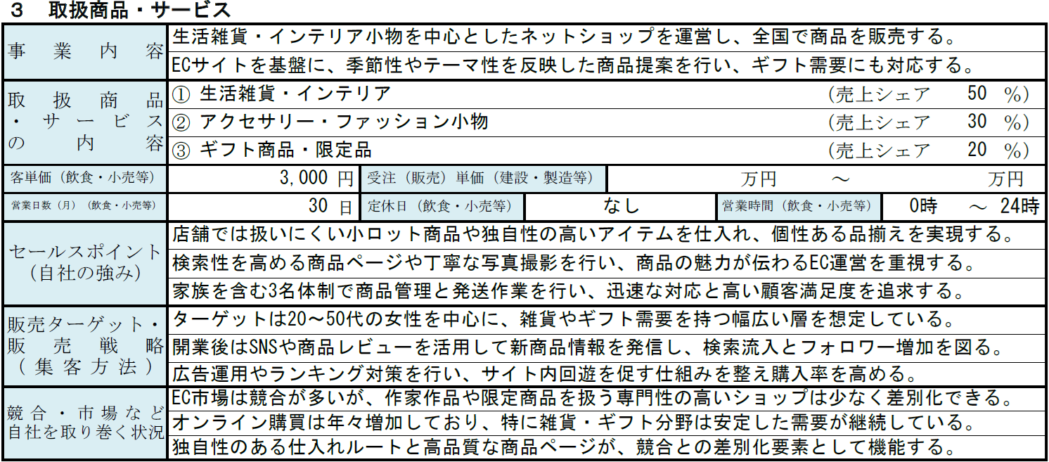 EC(ネットショップ)の記入例③ 取扱商品・サービス