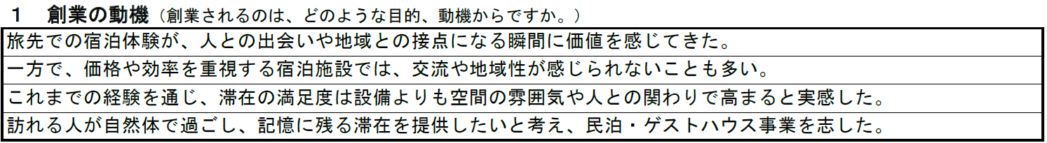 創業の動機では、民泊・ゲストハウスという形態に関心を持つようになった背景を整理して記載します。