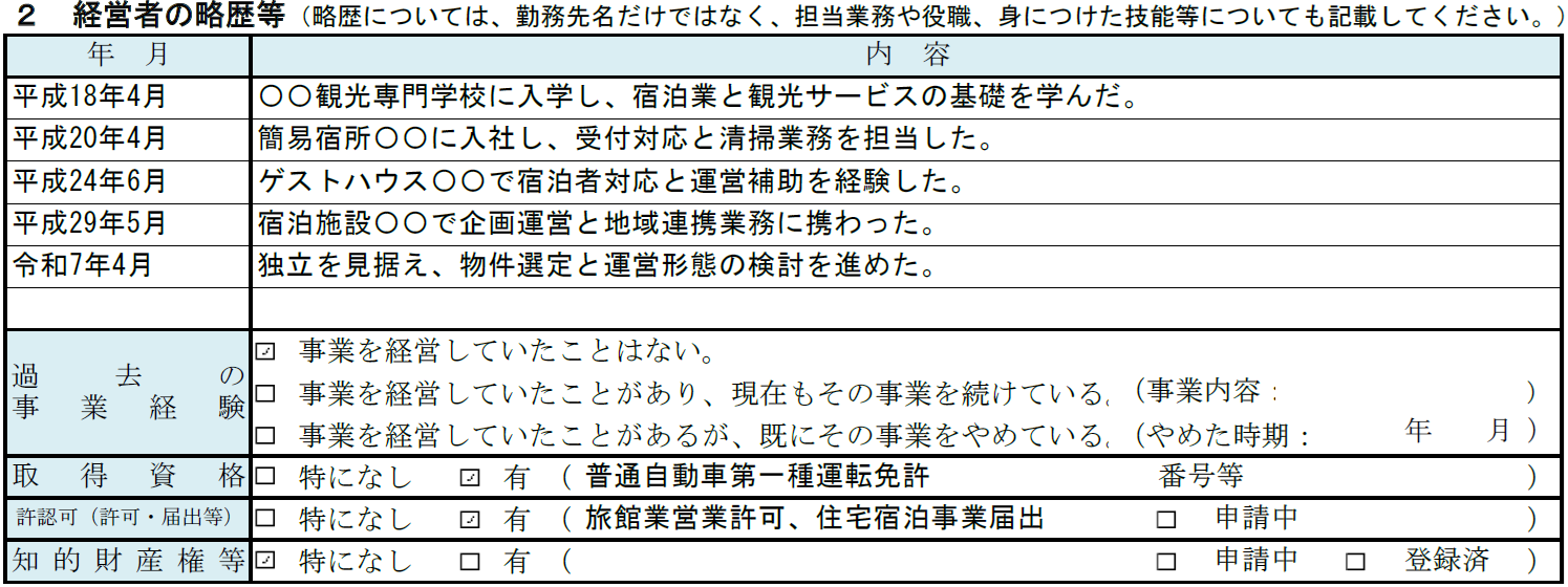 職務経験については、宿泊業に限らず、人と関わる仕事、空間を扱う仕事、運営や調整を行ってきた経験など、民泊・ゲストハウスの運営に応用できる内容を整理します。略歴全体として、これまでの経験がどのように事業運営につながるのかが読み手に伝わるよう、要点を絞って記載することが大切です。