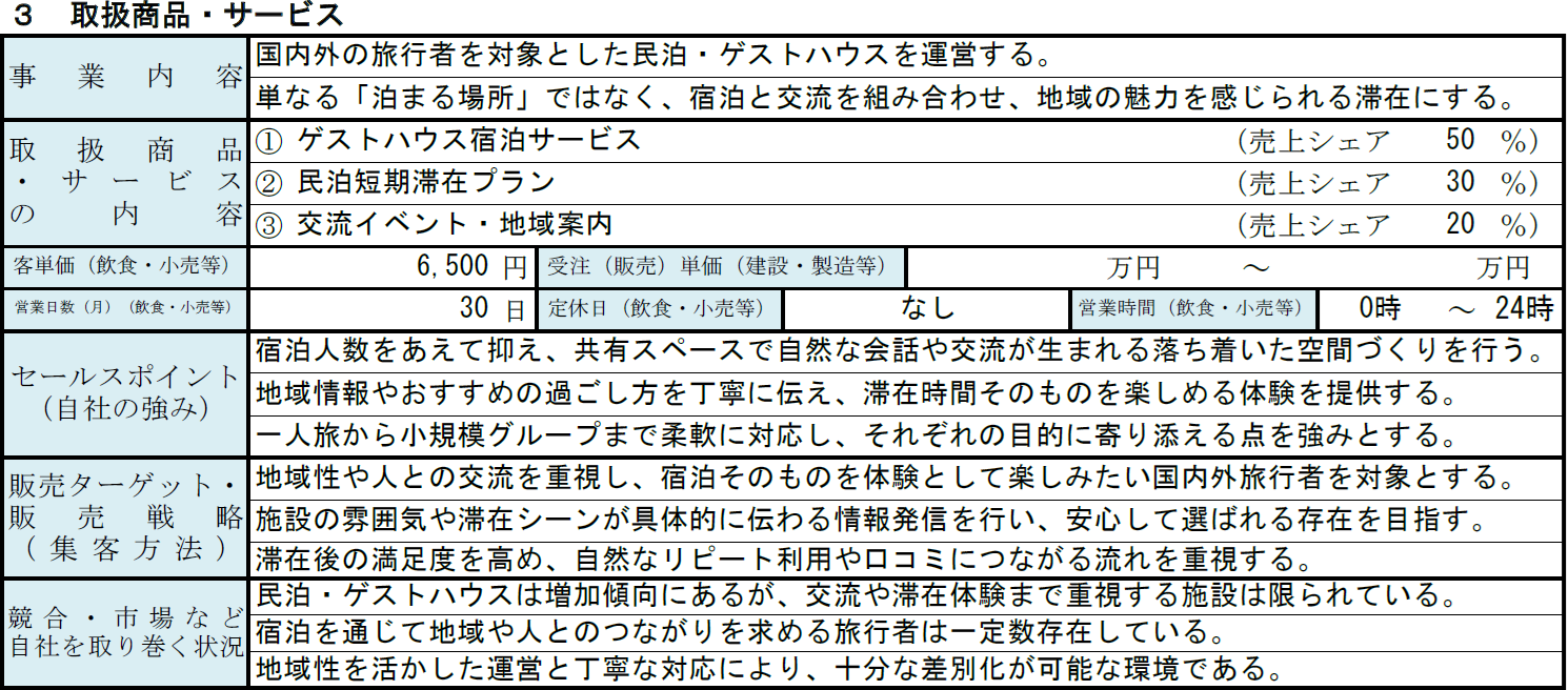取扱商品・サービスの内容では、事業の中心となるサービス内容を3つ整理します。例えば、短期滞在向けの基本プラン、連泊を想定した滞在型プラン、共用スペースの利用を前提とした交流型プランなど、事業の特徴が分かるものを挙げる形が考えられます。