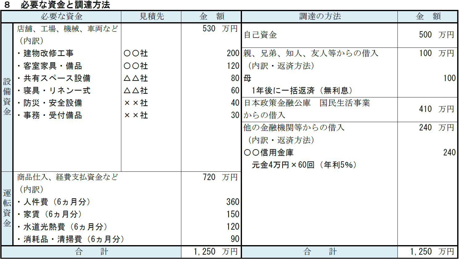 民泊・ゲストハウスの記入例⑧ 必要な資金と調達方法