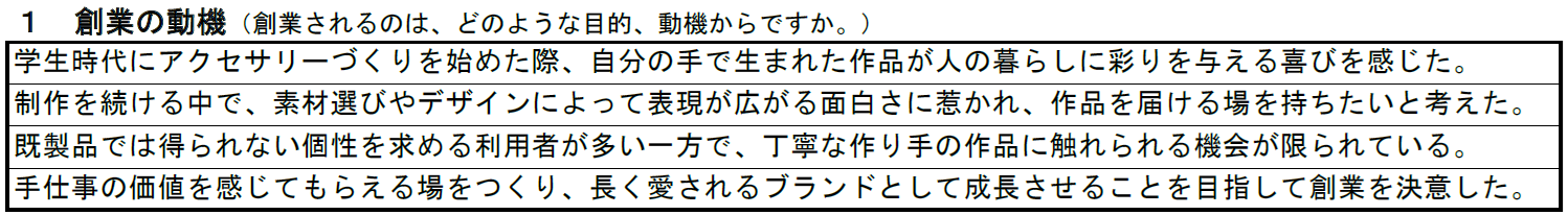 また、マーケットイベントに参加した経験、ハンドメイド仲間との交流、素材メーカーの調査、ECサイトの研究など、創業に向けた準備の積み重ねを添えることで、事業に対する理解を深めてきた様子が読み手にも伝わります。
