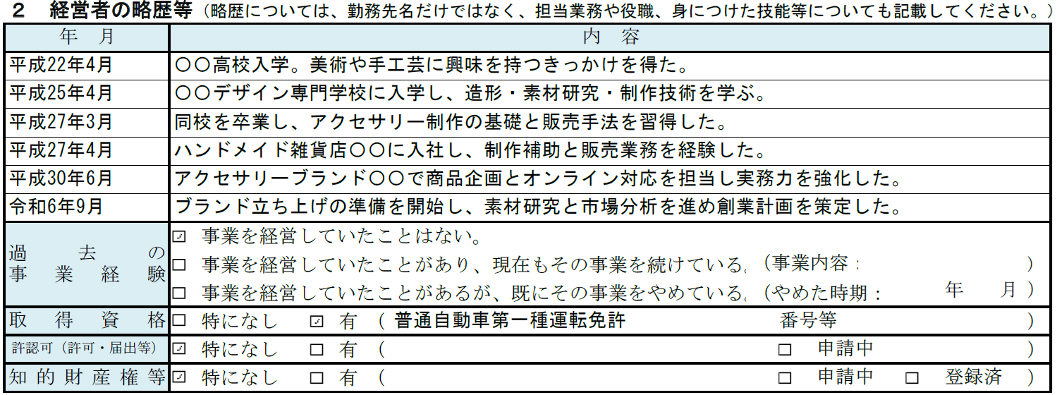 さらに、素材の研究や技術の練習、デザインの検討、オンライン販売の準備など、日々の積み重ねを続けてきたことを記載すると、創業に向けて丁寧に歩んできた姿が自然に伝わります。