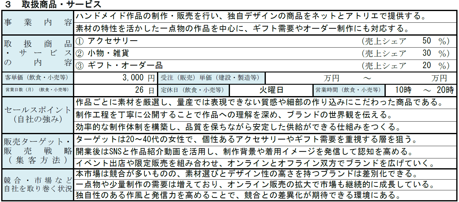 ハンドメイド事業の記入例③ 取扱商品・サービス