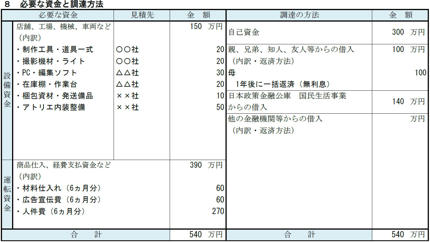 ハンドメイド事業の記入例⑧ 必要な資金と調達方法
