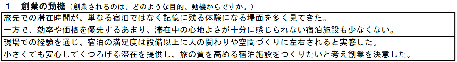 創業の動機では、宿泊業という分野に関心を持つようになった背景や、なぜホテルという事業形態を選んだのかを整理して記載します。