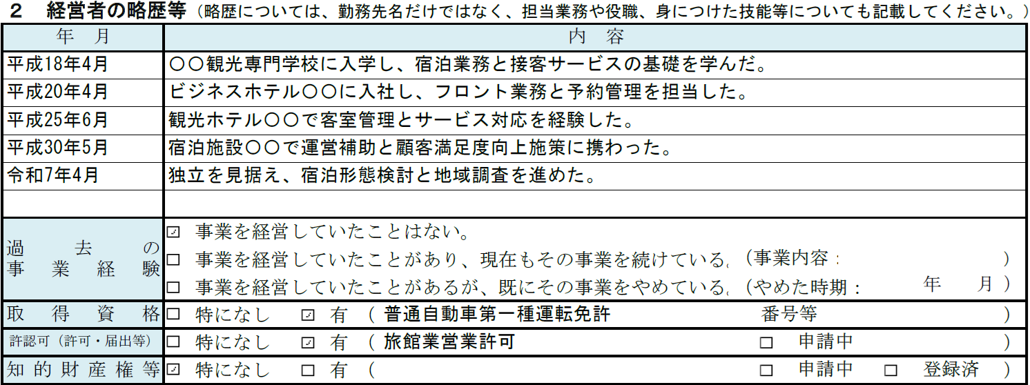 経営者の略歴等では、学歴と職務経験を時系列で整理し、宿泊業の運営につながる要素が読み手に伝わるように記載します。